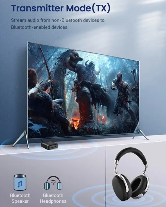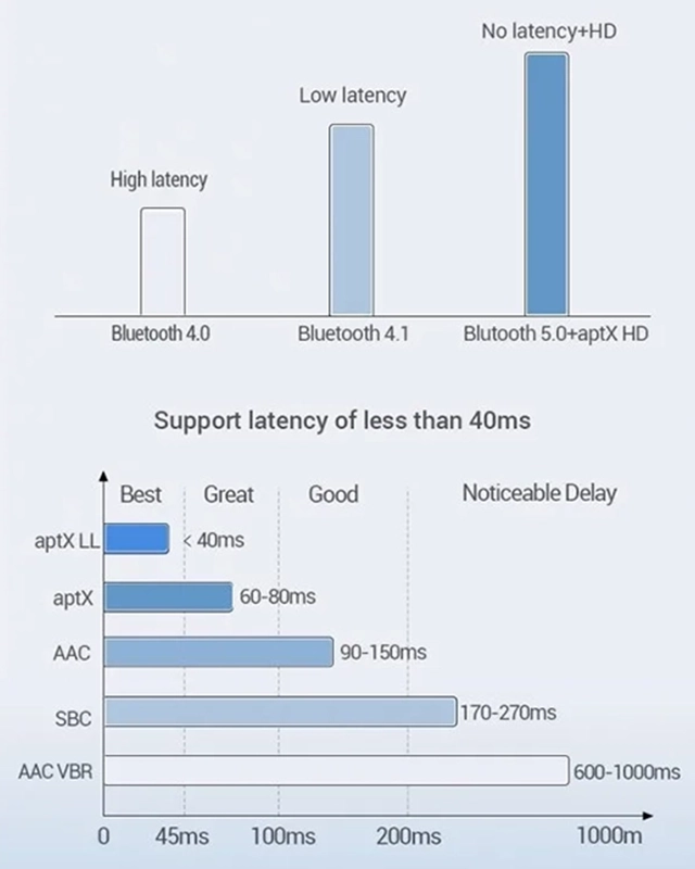 این دستگاه میتواند تأخیر صدا را تا زیر ۴۰ میلیثانیه کاهش دهد که این میزان، برای چشم و مغز انسان تقریباً غیرقابل تشخیص است. در مقایسه، تأخیر در بلوتوثهای استاندارد میتواند تا ۲۰۰ میلیثانیه یا بیشتر هم باشد. این ویژگی به خصوص در مود فرستنده (TX) هنگام اتصال تلویزیون به هدفون بیسیم بسیار حیاتی است؛ زیرا تضمین میکند که صدا و حرکت لب بازیگران یا اکشنهای بازی کاملاً همزمان باشند. با این قابلیت، تجربه شما از بازیهای رقابتی که نیاز به پاسخدهی سریع صوتی دارند، به میزان قابل توجهی بهبود مییابد. هنگام خرید هدفون برای استفاده با این دستگاه، توجه به پشتیبانی هدفون از aptX Low Latency برای دستیابی به بهترین نتیجه ضروری است، در غیر این صورت، دستگاه از بهترین کدک مشترک بین دو دستگاه استفاده خواهد کرد.