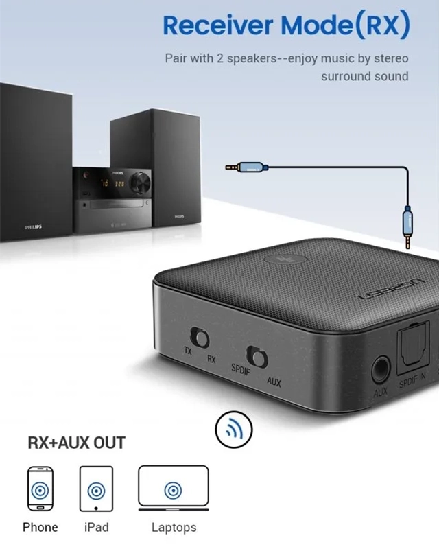UGREEN CM144 یک دستگاه دوکاره است که به کاربر این امکان را میدهد تا به راحتی بین دو حالت عملکردی کلیدی یعنی فرستنده (Transmitter / TX) و گیرنده (Receiver / RX) جابهجا شود و بدین ترتیب انعطافپذیری فوقالعادهای در سناریوهای مختلف فراهم میآورد. این جابهجایی معمولاً از طریق یک دکمه یا سوئیچ فیزیکی روی بدنه دستگاه انجام میشود و کاربری بسیار سادهای دارد.