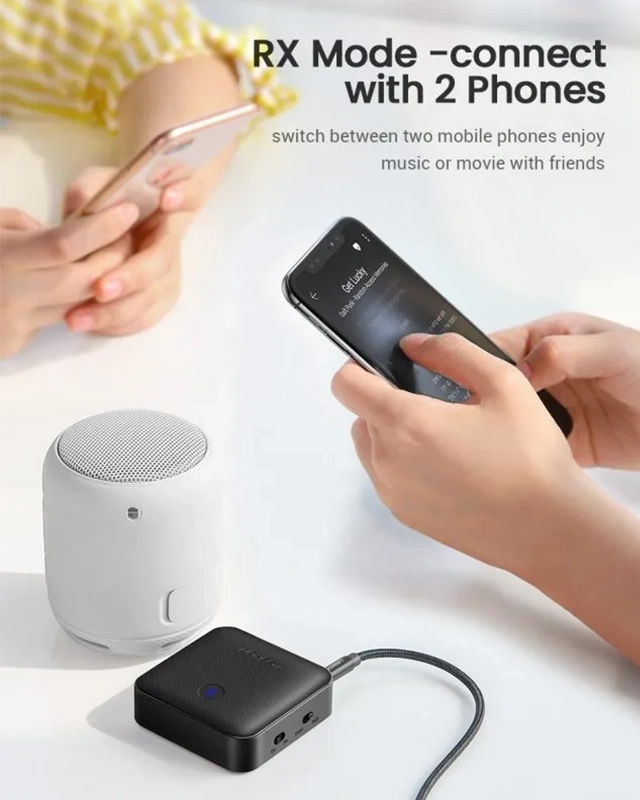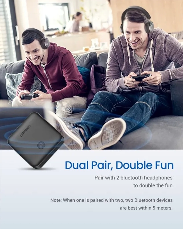 یکی از ویژگیهای برجسته و بسیار کاربردی در حالت فرستنده (TX)، قابلیت اتصال همزمان UGREEN CM144 به دو دستگاه بلوتوثی (دو هدفون یا دو اسپیکر بیسیم) است. این قابلیت، به خصوص برای زوجها، دوستان یا اعضای خانوادهای که میخواهند بهطور همزمان و بدون ایجاد مزاحمت برای محیط، به تماشای یک فیلم یا برنامه تلویزیونی بپردازند، ایدهآل است.