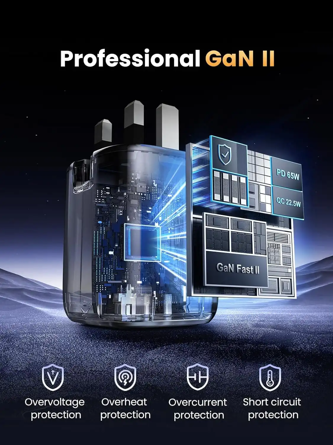 مجهز بودن به فناوری GaN II (نسل دوم نیترید گالیوم)، عامل اصلی کوچک و قدرتمند بودن شارژر یوگرین Nexode CD306 است. GaN یک ماده نیمه‌رسانا جدید است که جایگزین سیلیکون سنتی در شارژرها شده است. مزیت اصلی GaN در مقایسه با سیلیکون در این است که می‌تواند ولتاژهای بالاتری را تحمل کند و رسانایی بهتری داشته باشد، در حالی که گرمای کمتری تولید می‌کند. استفاده از نسل دوم (GaN II) این فناوری، پیشرفت‌های بیشتری را به همراه داشته است: ابعاد کوچکتر، افزایش بازدهی انرژی و بهبود مدیریت حرارت. در واقع، به دلیل تولید گرمای کمتر، قطعات داخلی می‌توانند به هم فشرده‌تر شوند، که نتیجه آن شارژری است که به طور قابل توجهی کوچکتر و سبک‌تر از شارژرهای 65 وات سنتی مبتنی بر سیلیکون است. علاوه بر این، کنترل بهتر دما و ولتاژ توسط GaN II، به معنای شارژ ایمن‌تر و طول عمر بیشتر هم برای خود شارژر و هم برای باتری دستگاه‌های شماست. این فناوری پیشرفته تضمین می‌کند که شما یک محصول با کارایی بالا در اختیار دارید که در عین سرعت بخشیدن به فرآیند شارژ، از دستگاه‌های ارزشمند شما در برابر نوسانات برق و گرمای اضافی محافظت می‌کند. GaN II واقعاً یک تحول بزرگ در طراحی شارژرهای سریع ایجاد کرده است.