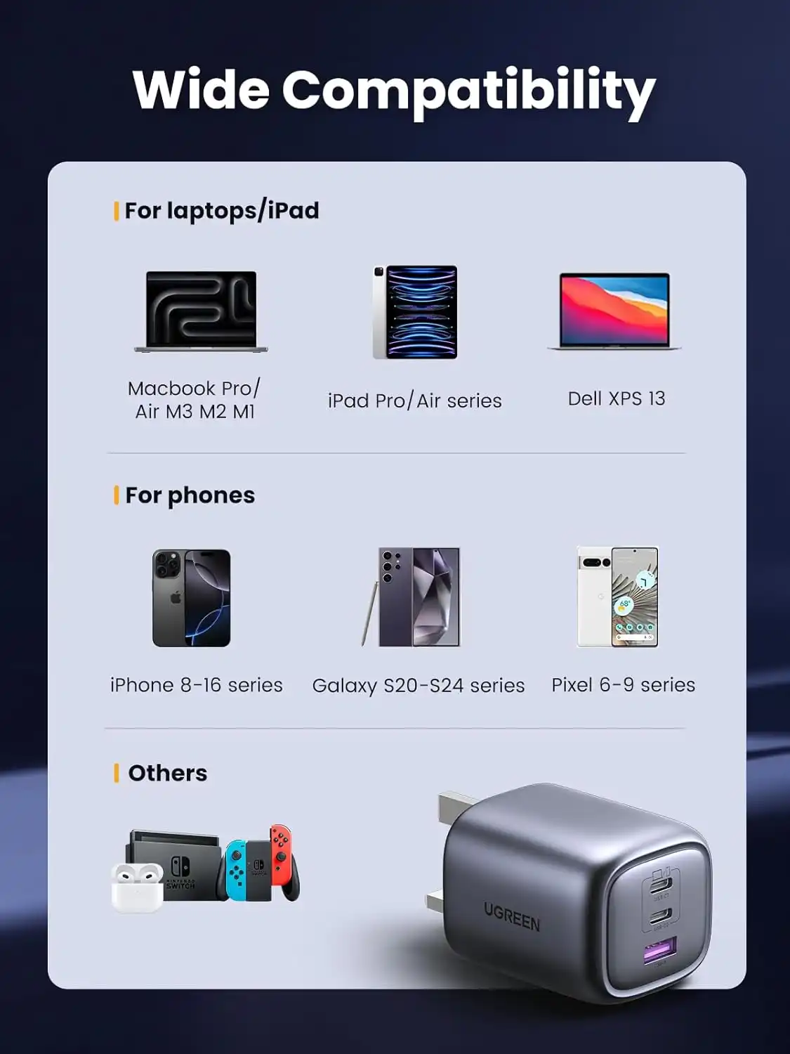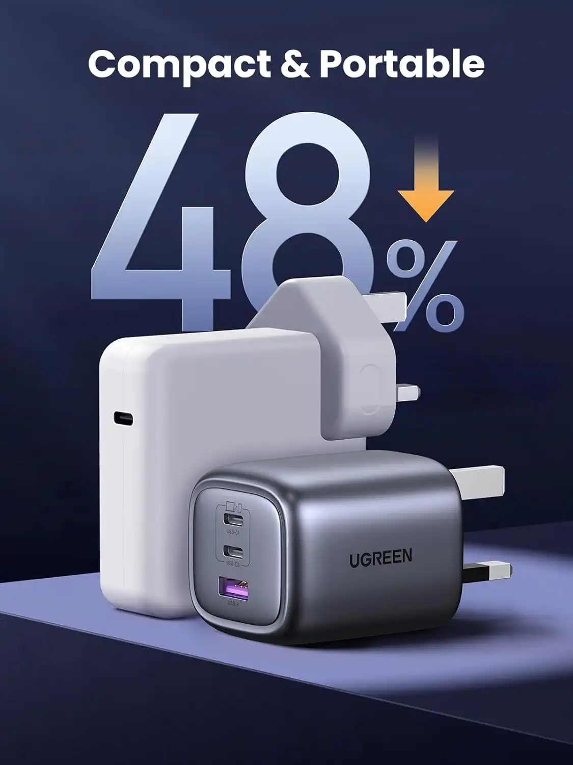 شارژر 65 وات یوگرین UGREEN USB C Charger Nexode 65W CD306 یک انتخاب فوق‌العاده و مقرون به صرفه برای هر کسی است که به دنبال یک راه‌حل شارژ سریع، ایمن و همه‌کاره است. ترکیب دو پورت قدرتمند USB C 65W، پورت سازگار USB A 22.5W و توان خروجی کلی 65 وات، آن را برای شارژ همزمان تمامی دستگاه‌های حیاتی شما مناسب می‌سازد. به کارگیری فناوری پیشرفته GaN II نه تنها ابعاد آن را به طور شگفت‌انگیزی کوچک کرده، بلکه عملکرد حرارتی و ایمنی آن را نیز بهبود بخشیده است. این شارژر یک سرمایه‌گذاری هوشمندانه برای کاهش شلوغی و افزایش بهره‌وری شما در خانه، دفتر کار یا در سفر است. با یوگرین نکسود CD306، شما دیگر نیازی به آداپتورهای متعدد ندارید و می‌توانید با خیال راحت، تمام ابزارهای دیجیتال خود را به سرعت برق و باد شارژ کنید.